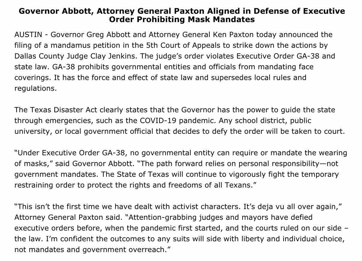 Greg Abbott on Thursday signed an executive order prohibiting mask mandates or COVID-19 vaccine requirements from government agencies and municipalities statewide. Greg Abbott Claiming Hes Using COVID-19 Pandemic to Treat the Lone Star State Like a Dictatorship. Top Lawyer for Texass Largest County Sues Gov.